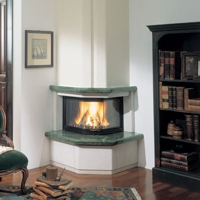 Компактная модель камина Lady с плитой из зеленого мрамора Verde Guatemala, цоколь и боковые части выполнены в бучардированном мраморе Trani.